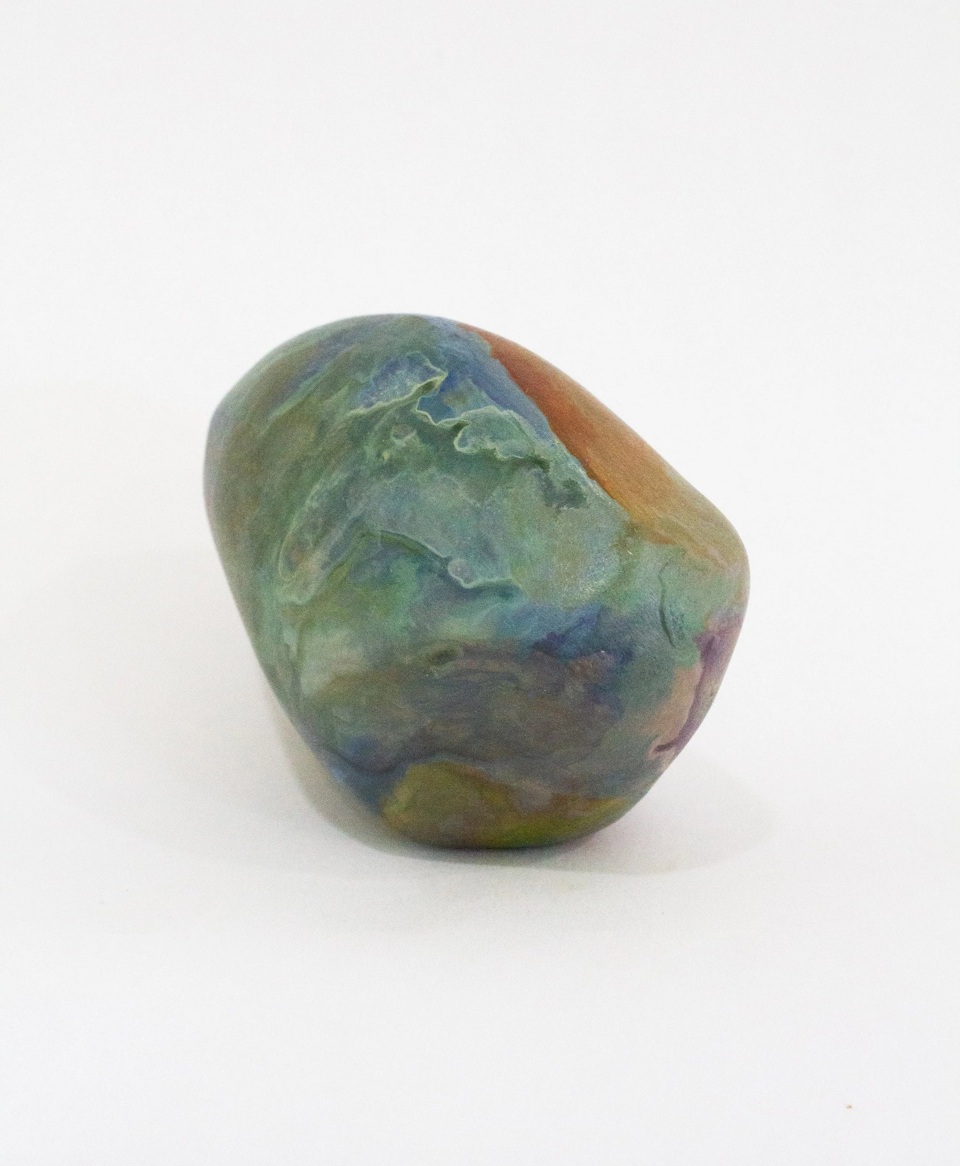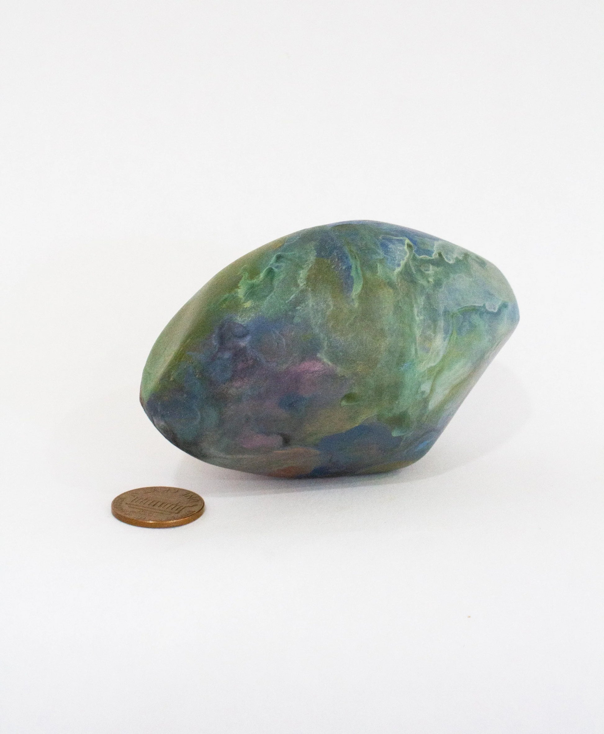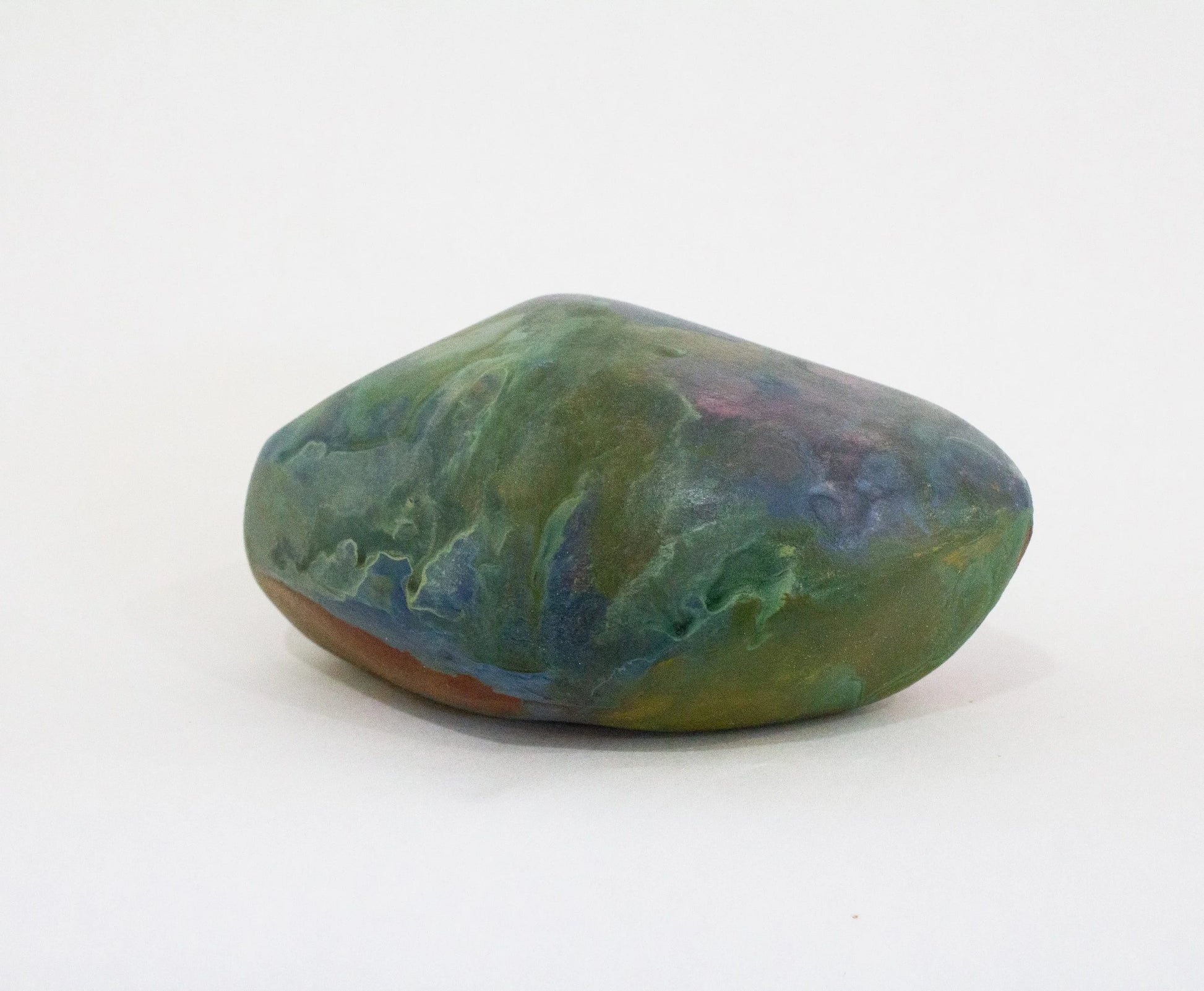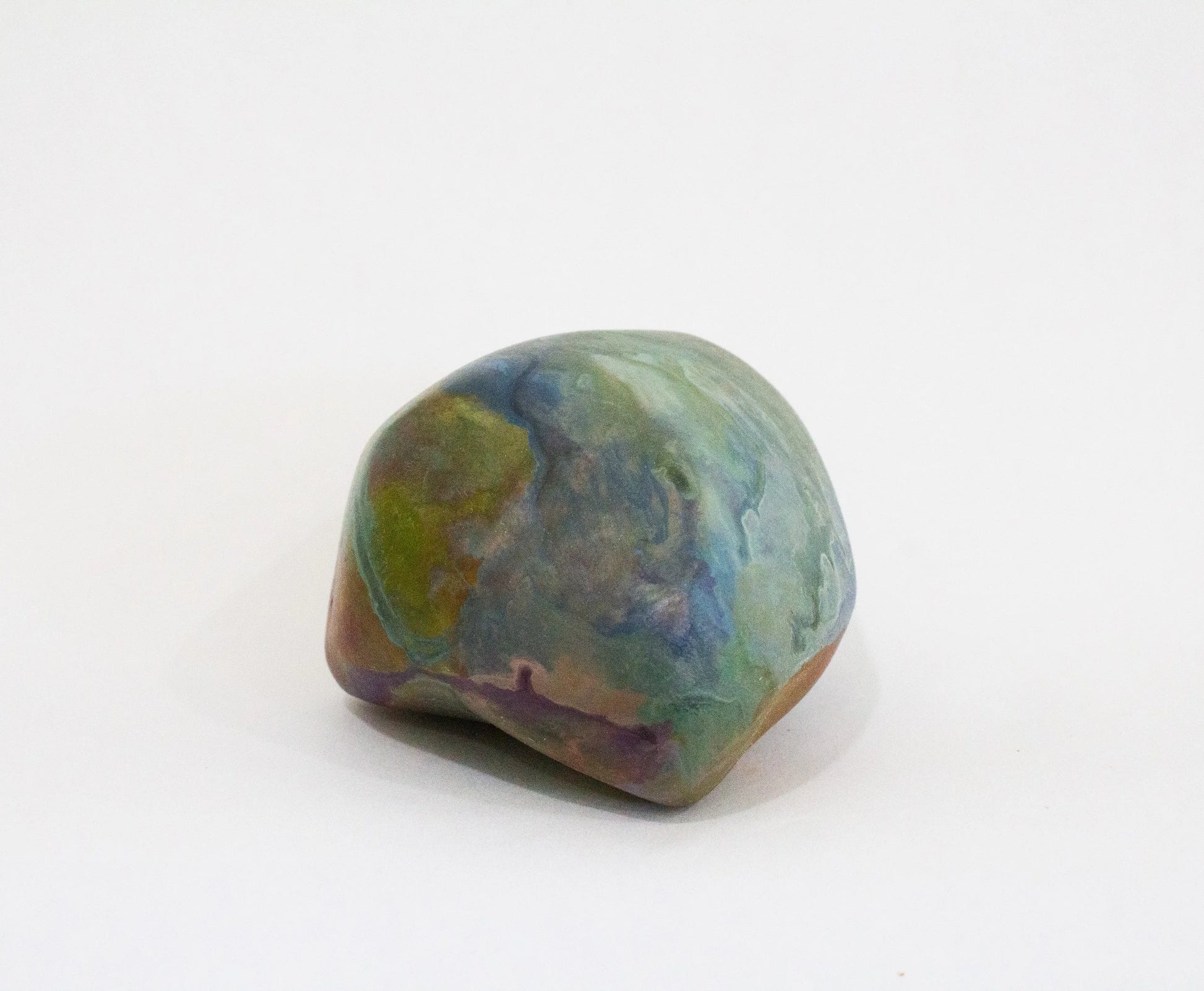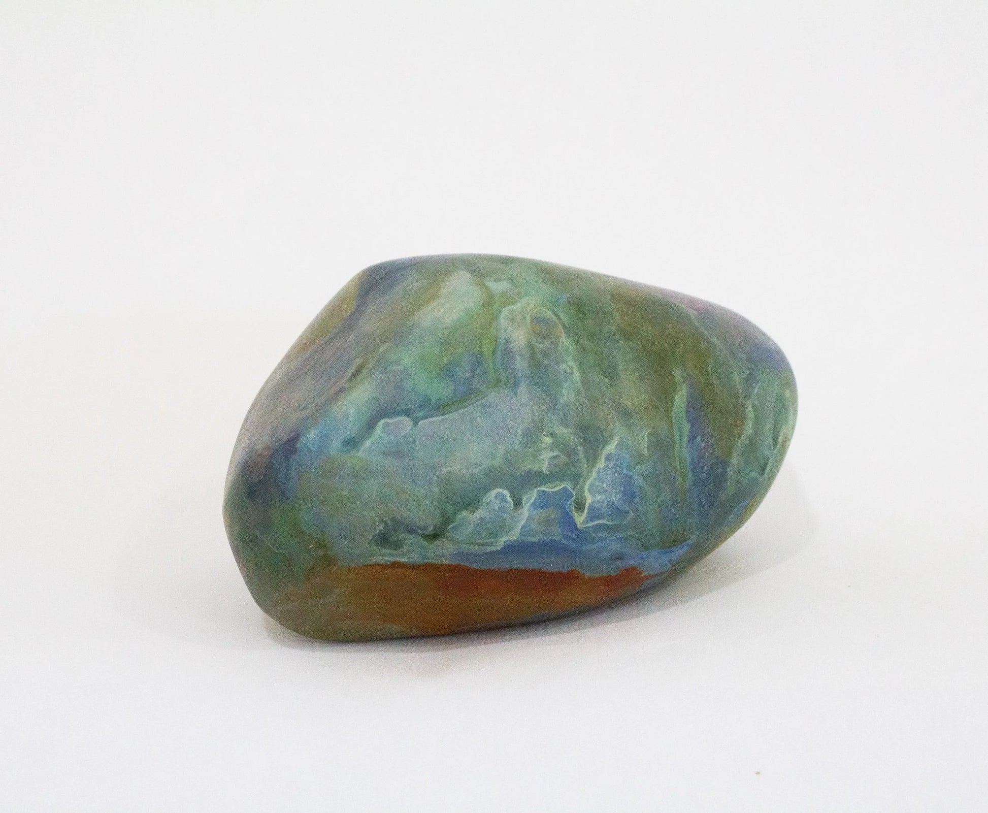 Similar to the series A·BOD·E, I craft each piece out of numerous thin layers of papier mâché and joint compound that I slowly build up and sand away until the surface resembles the well-worn stone that once lived in my coat pocket. Each piece is then hand painted with delicate layers of acrylic and finished with a coat of polyurethane for durability.