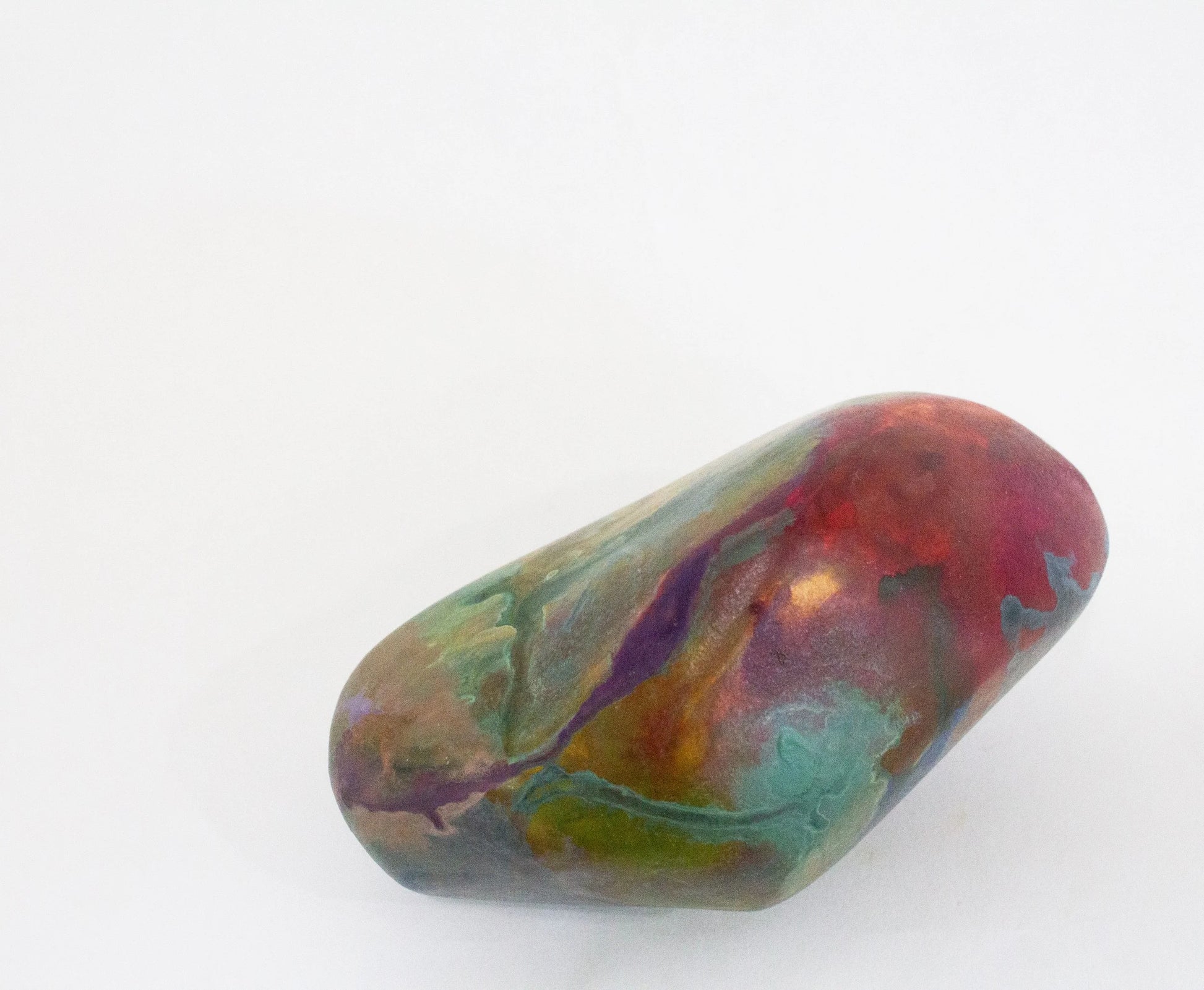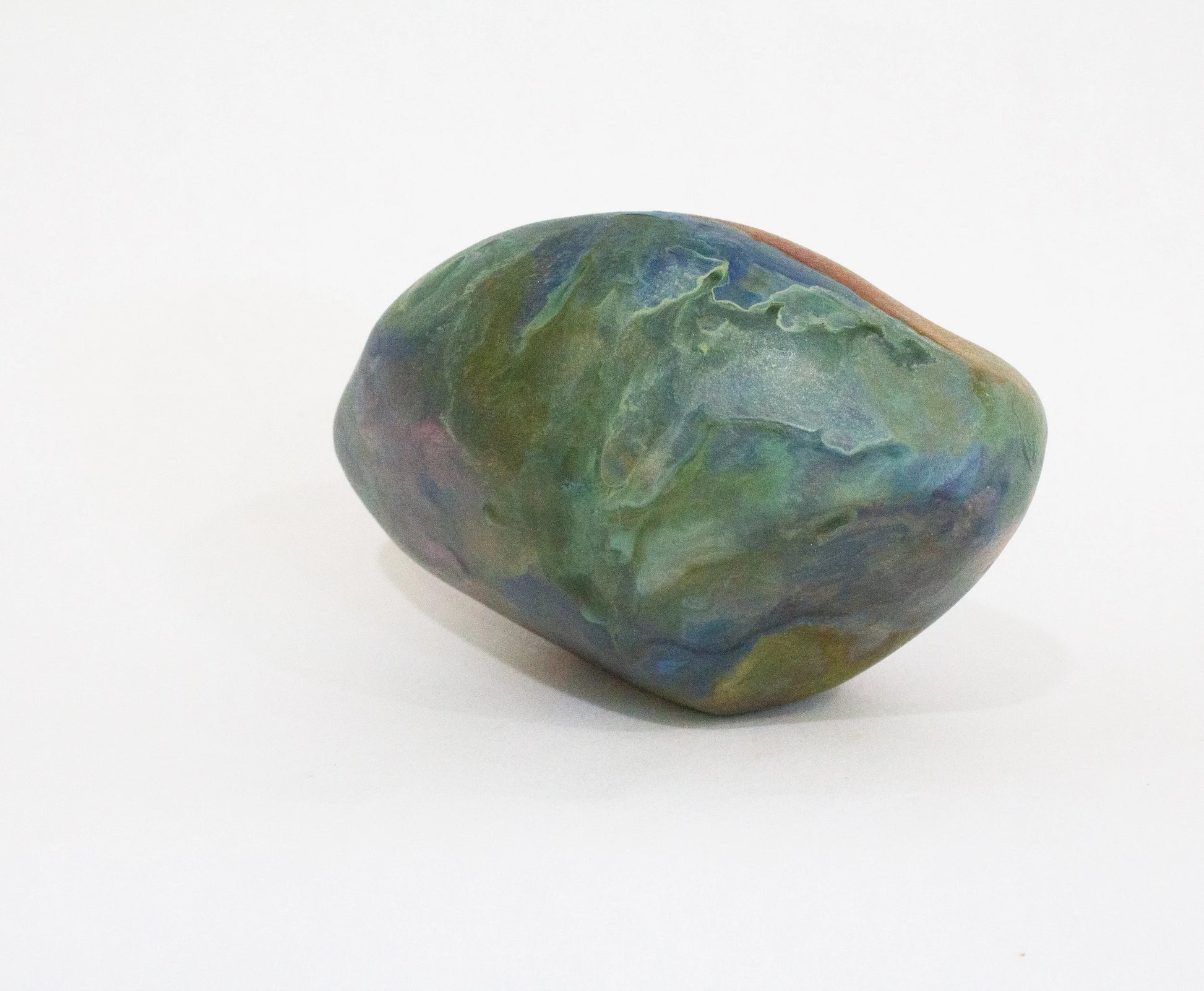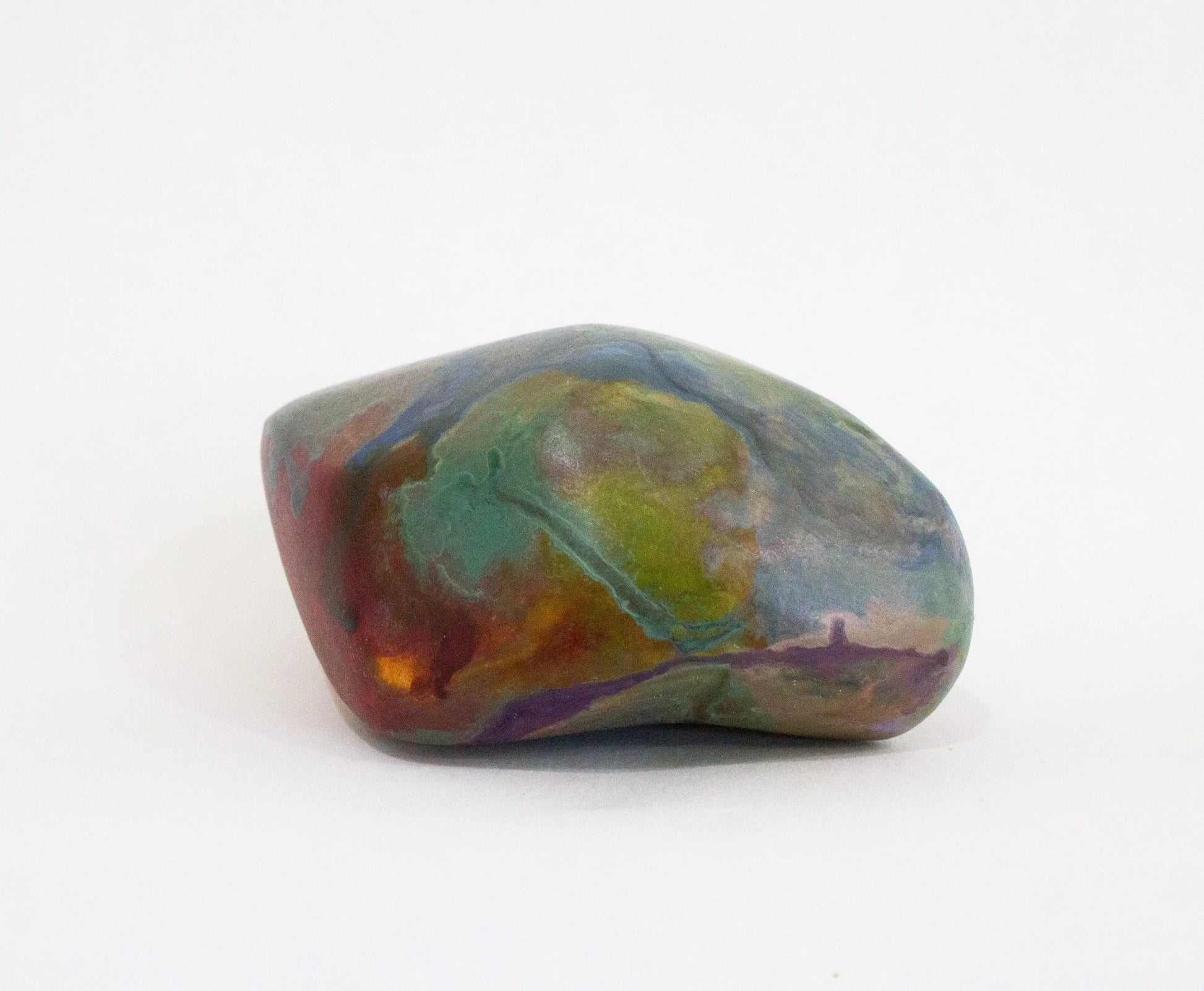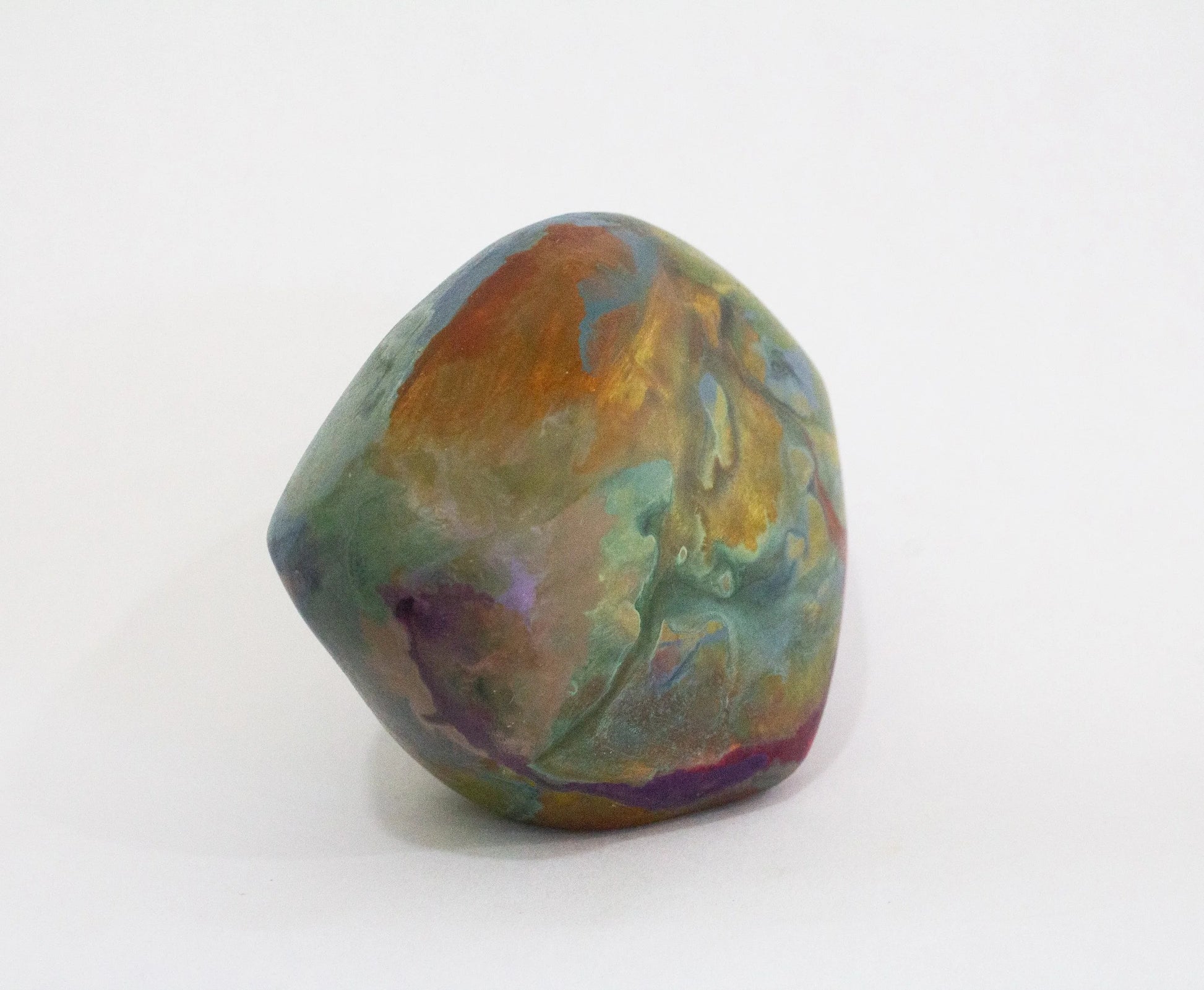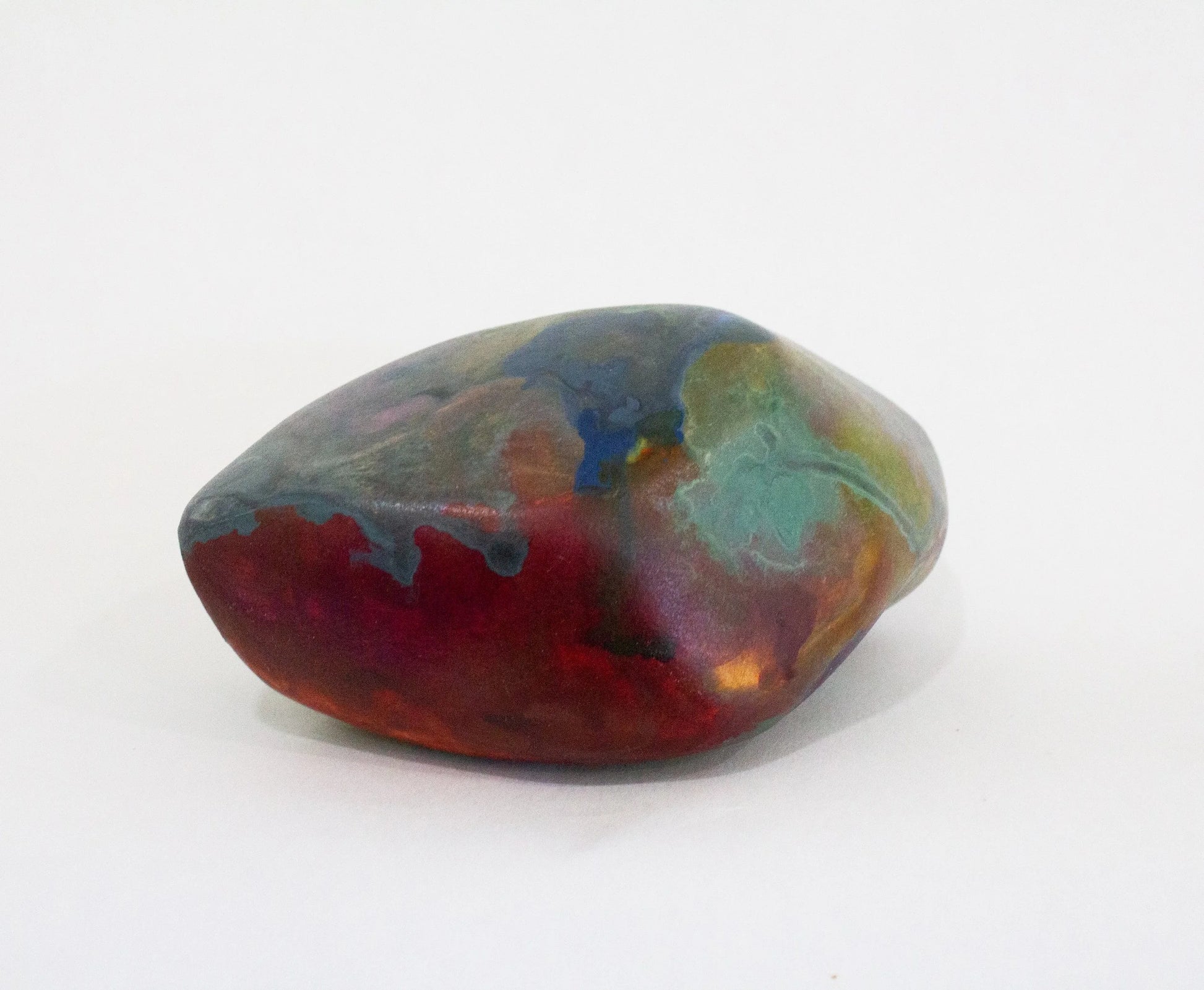 Similar to the series A·BOD·E, I craft each piece out of numerous thin layers of papier mâché and joint compound that I slowly build up and sand away until the surface resembles the well-worn stone that once lived in my coat pocket. Each piece is then hand painted with delicate layers of acrylic and finished with a coat of polyurethane for durability.