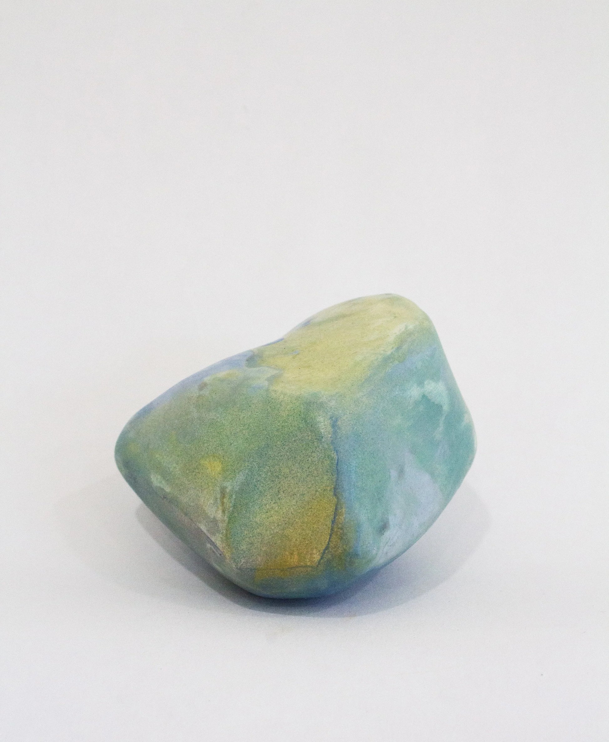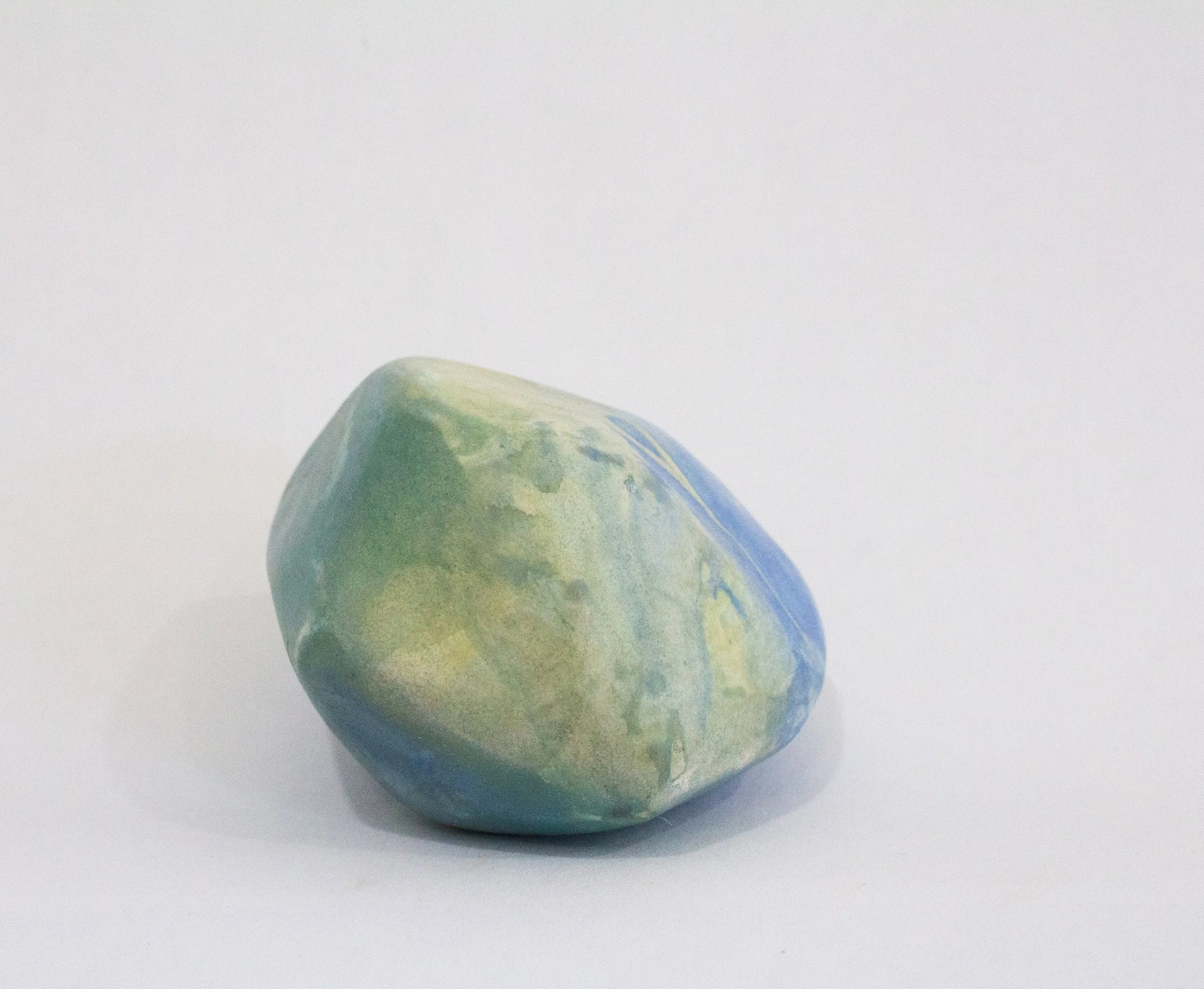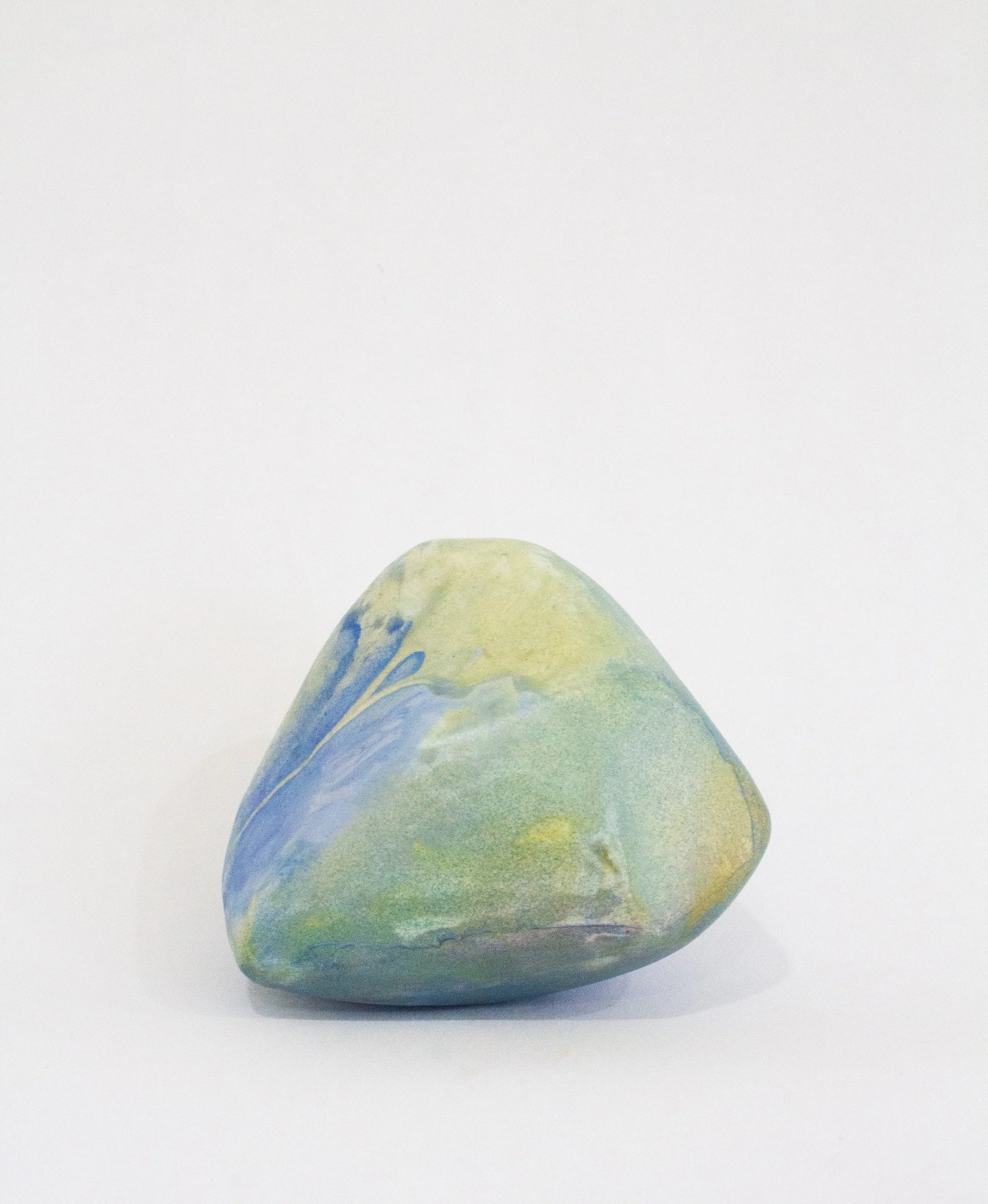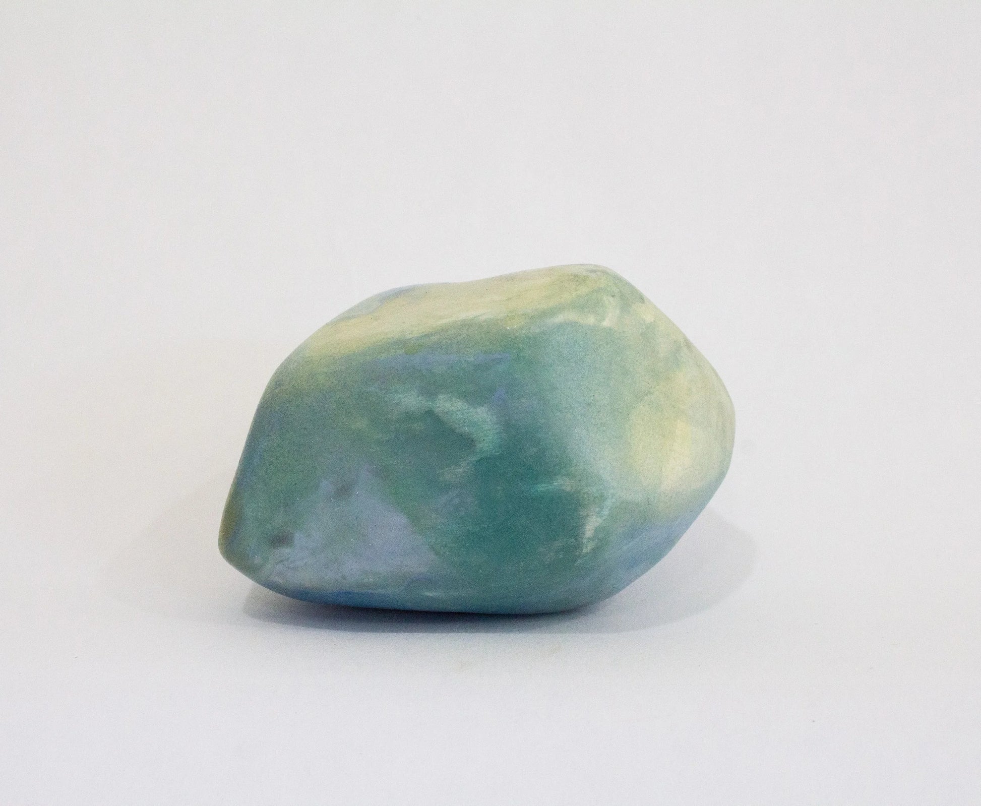 Similar to the series A·BOD·E, I craft each piece out of numerous thin layers of papier mâché and joint compound that I slowly build up and sand away until the surface resembles the well-worn stone that once lived in my coat pocket. Each piece is then hand painted with delicate layers of acrylic and finished with a coat of polyurethane for durability.