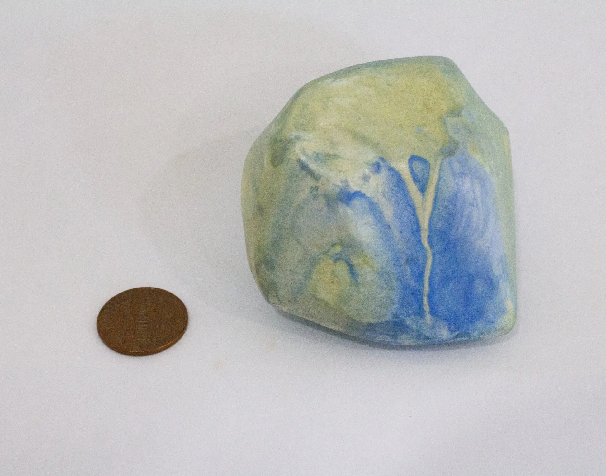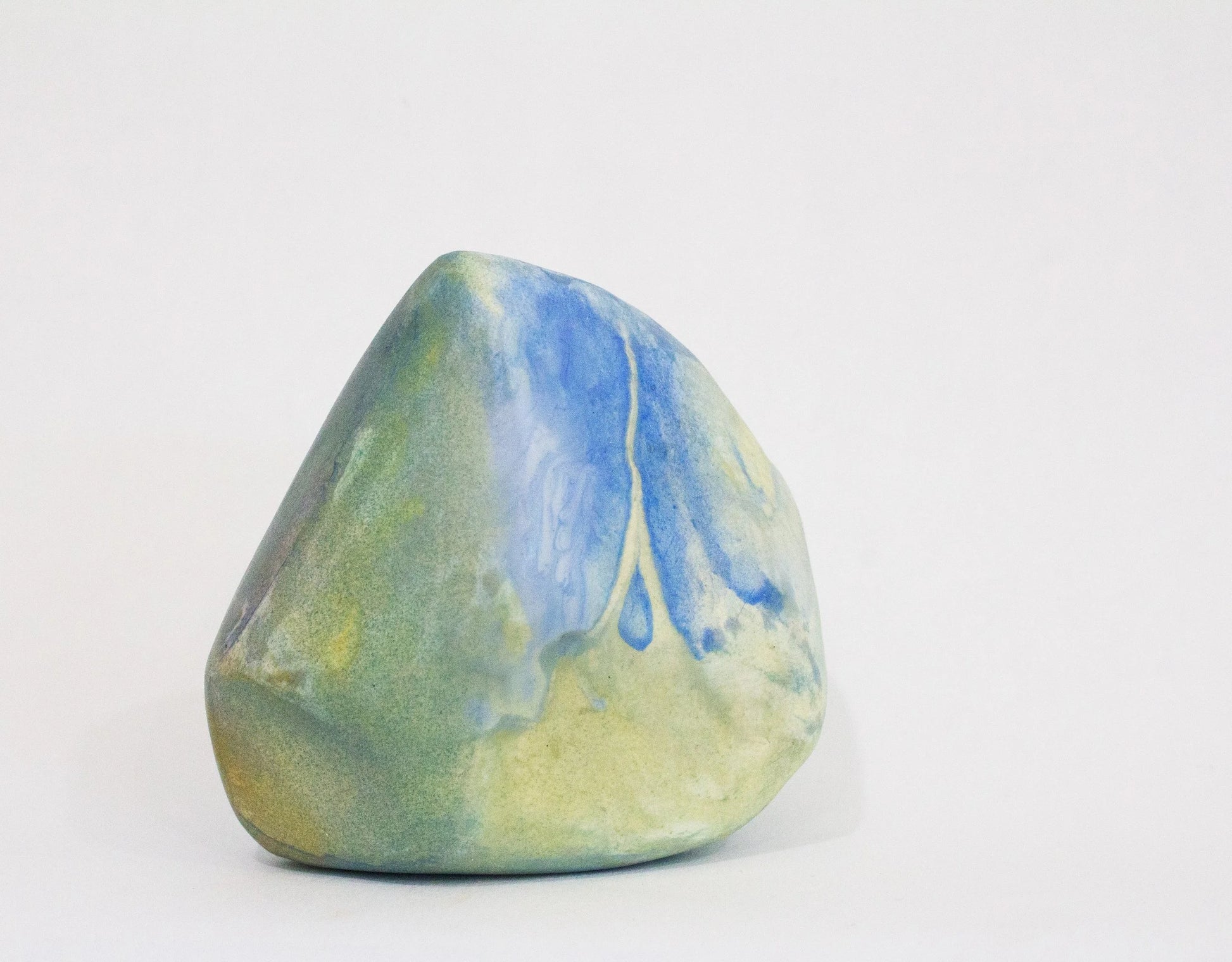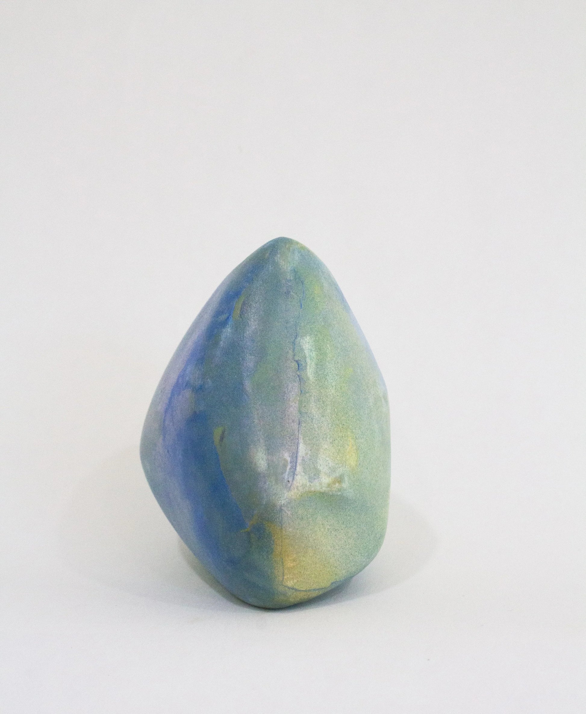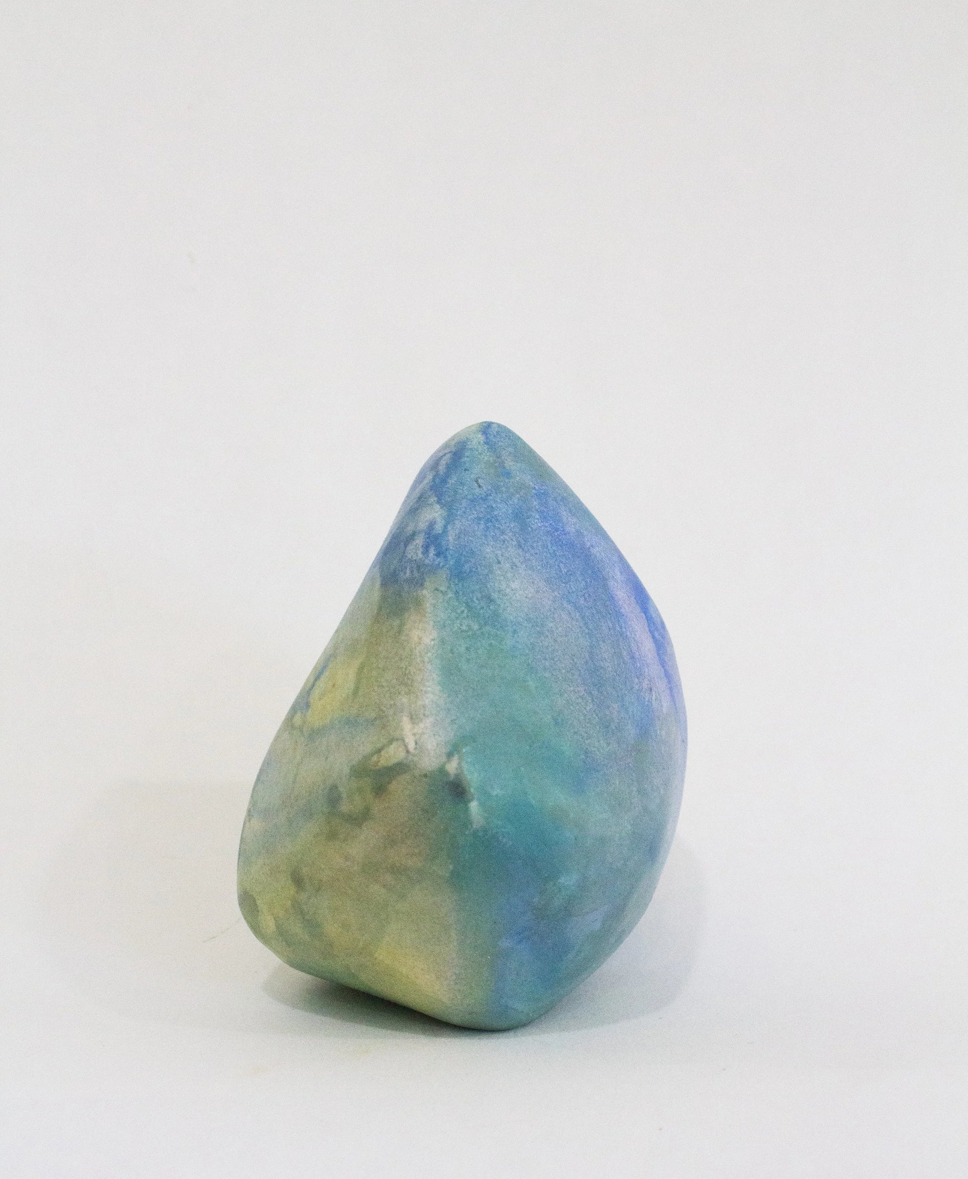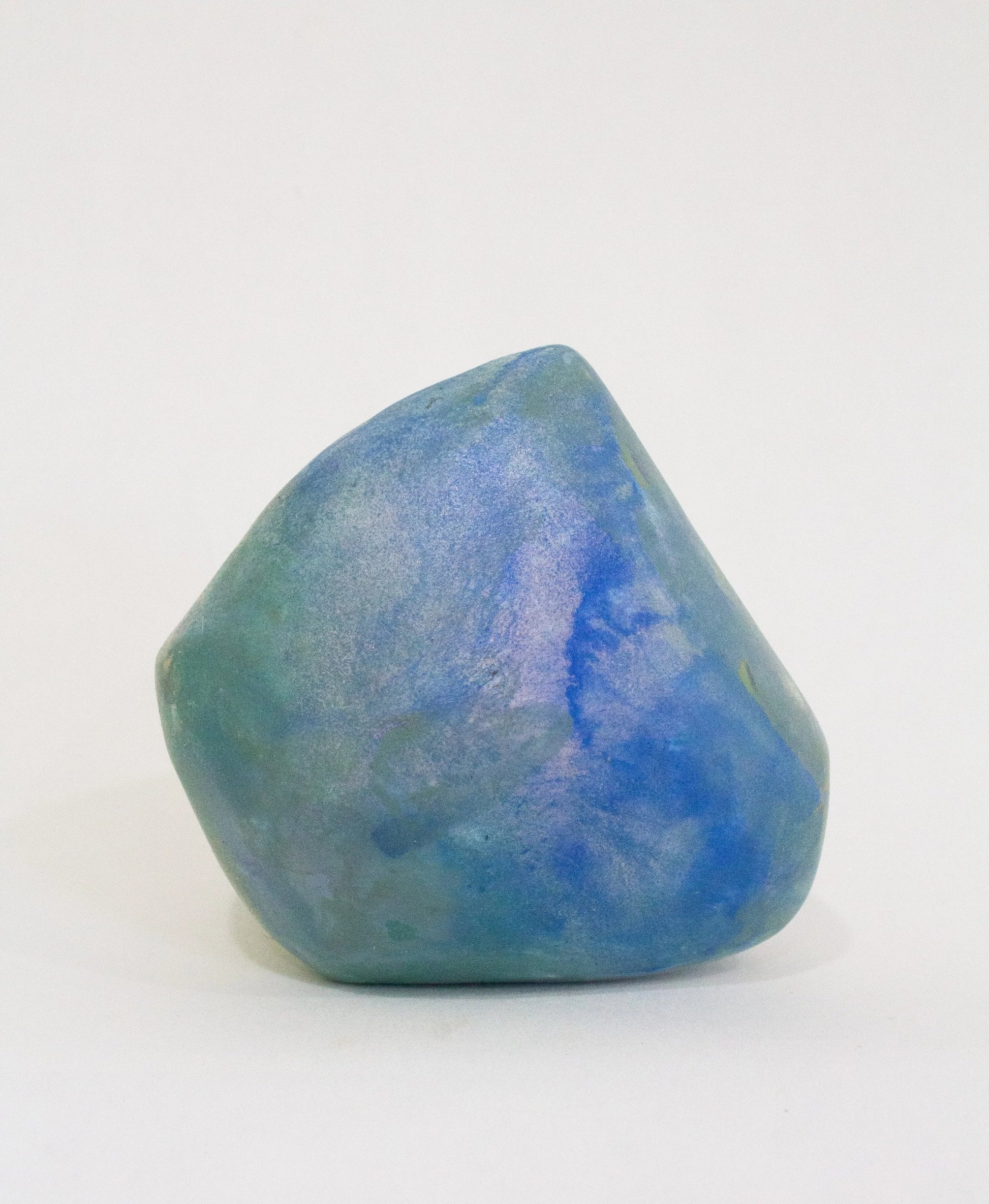 Similar to the series A·BOD·E, I craft each piece out of numerous thin layers of papier mâché and joint compound that I slowly build up and sand away until the surface resembles the well-worn stone that once lived in my coat pocket. Each piece is then hand painted with delicate layers of acrylic and finished with a coat of polyurethane for durability.