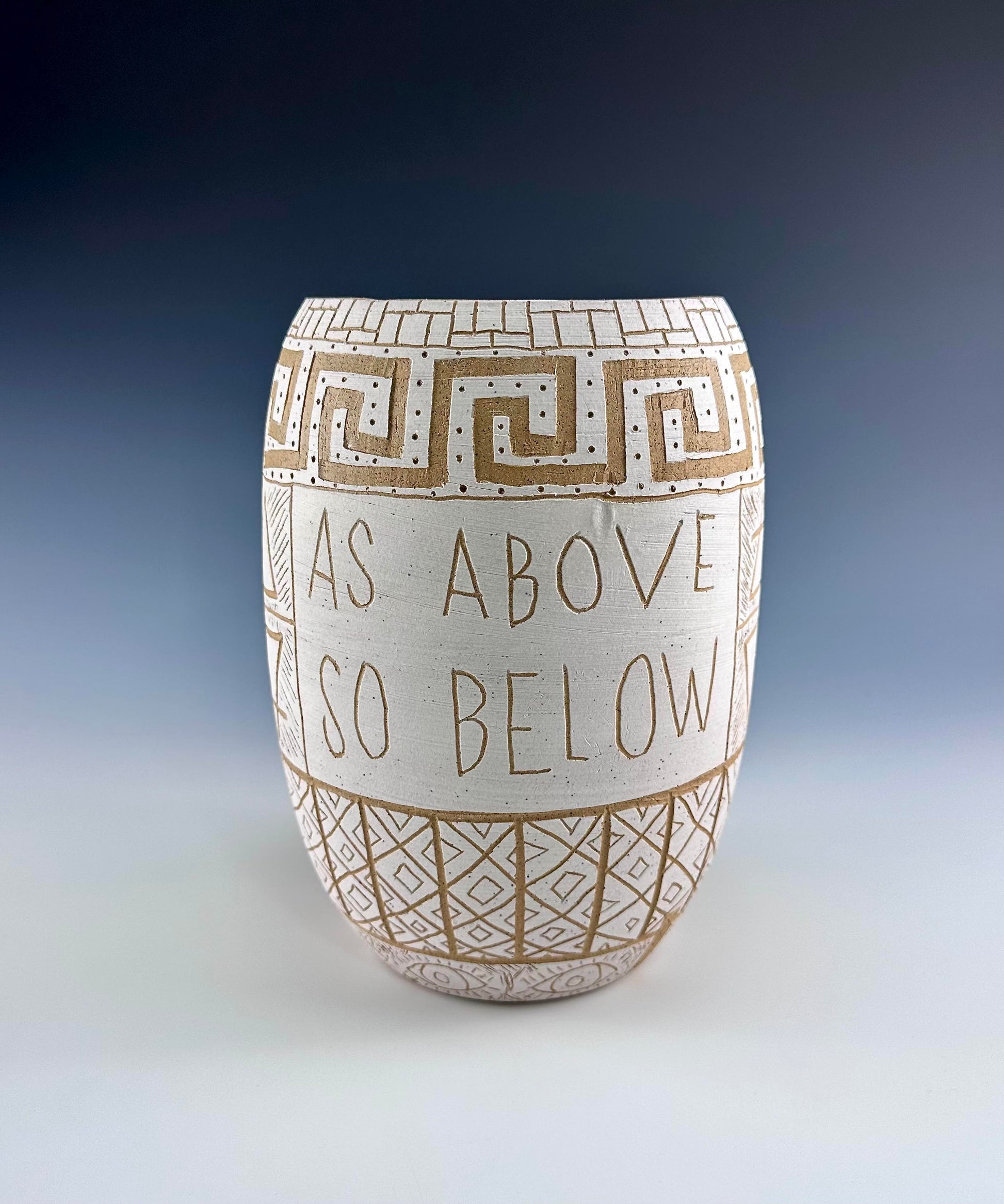 Benjamin works in ceramics bridges the deep past to the present moment, employing historic Levantine funerary vessels forms as an armature for declarative mark making rooted in contemporary poetry, punk rock, hiphop, and graffiti.
