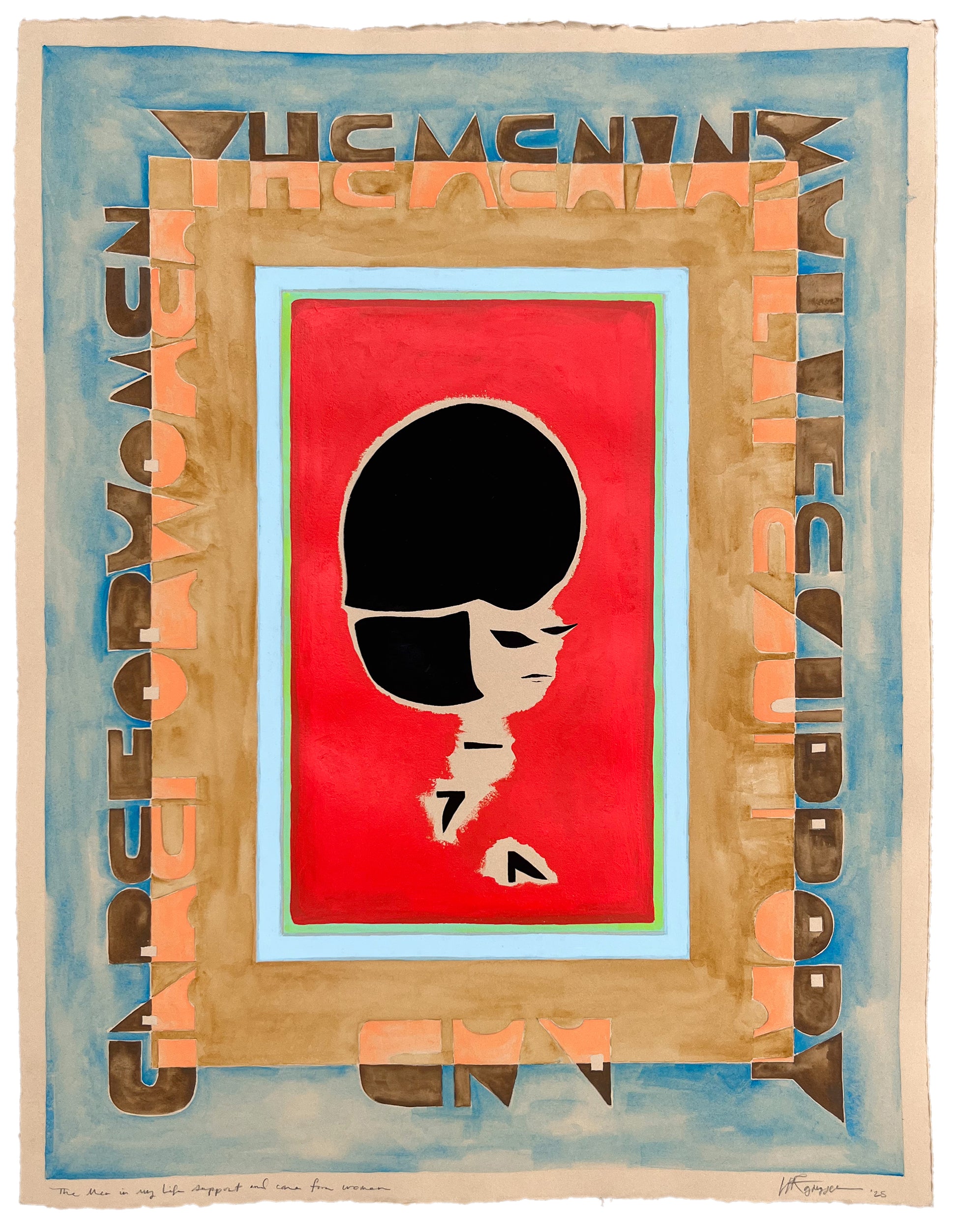 Lana Fee Rasmussen is a Lenape/Muscogee/Seminole multi-disciplinary artist working primarily on paper. With the use of humor and emphasis of craft, much of her work re-imagines Indigenous womanhood and experience. This work specifically interprets Lana’s Lenape Grandmother Sharon in her youth, while the lettering style is a nod to traditional Lenape ribbon motifs.