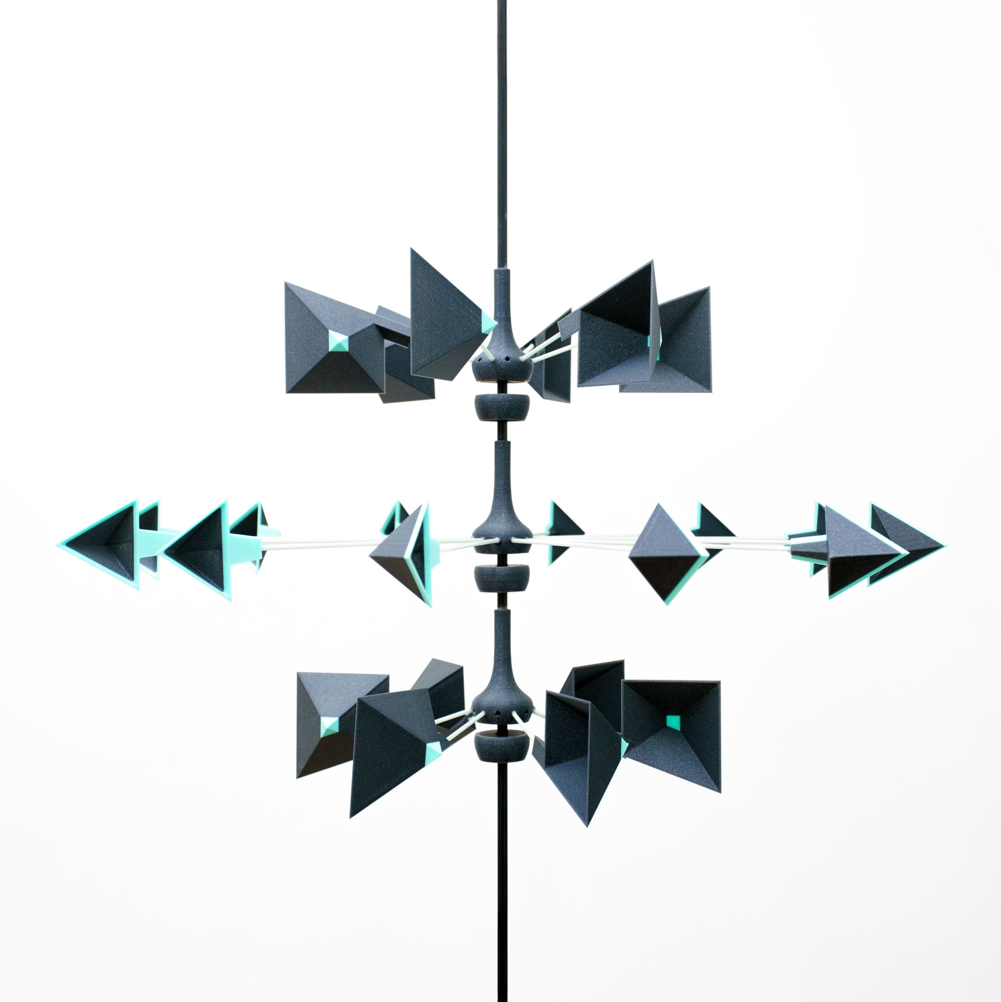 The piece rotates on a fiberglass rod that can be hung indoors or outdoors. You can also mount the spinners upright on a base (as shown in the gallery).
