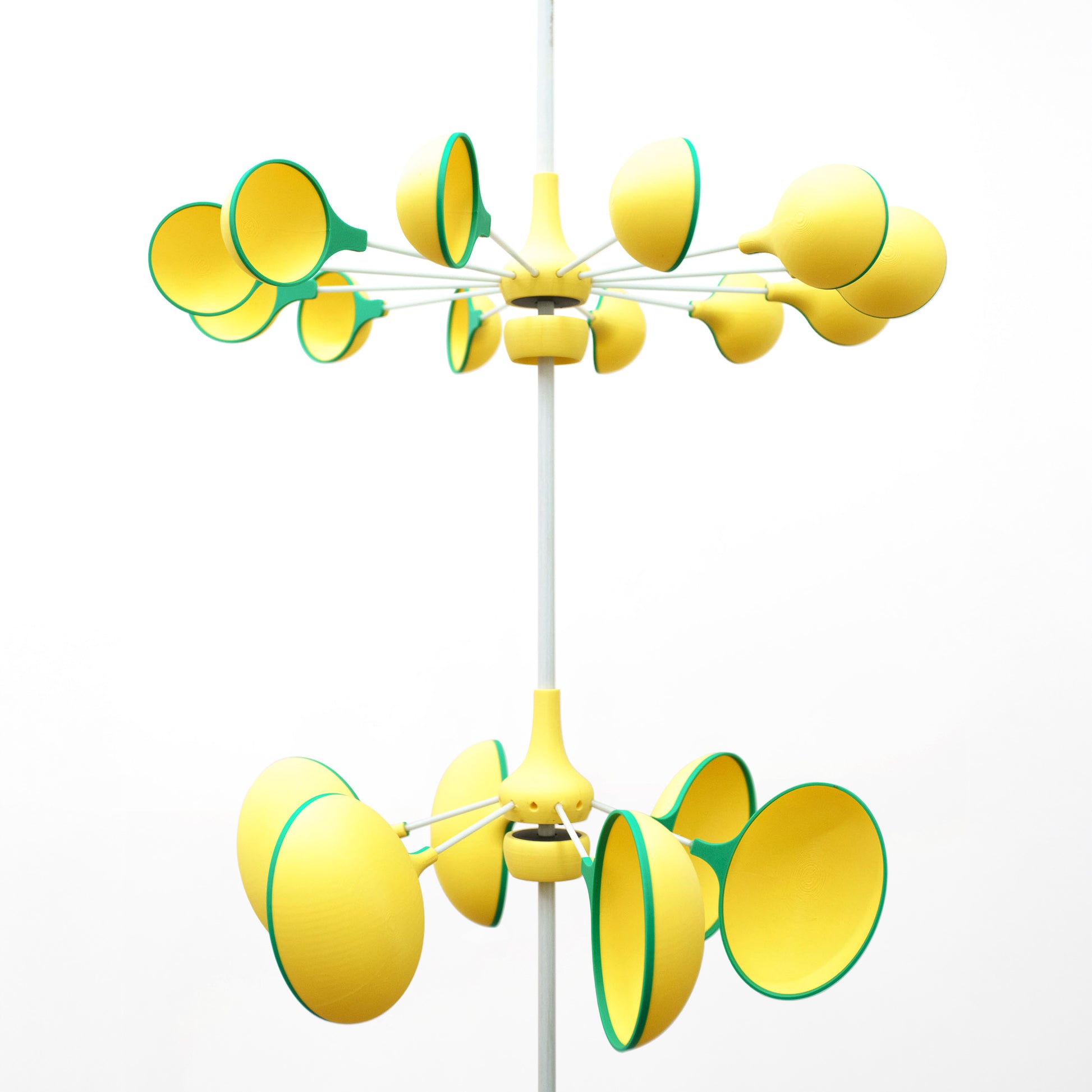 The piece rotates on a fiberglass rod that can be hung indoors or outdoors. You can also mount the spinners upright on a base (as shown in the gallery).